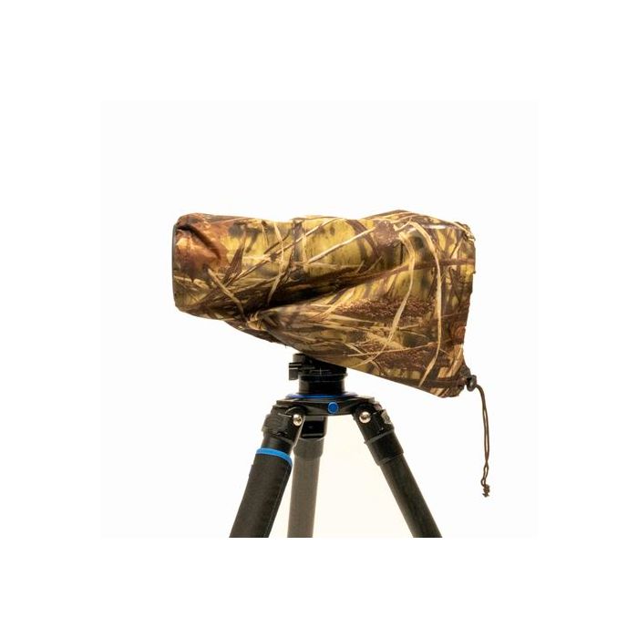 The Rain Cover 1 Reed for lenses from 70-200 up to 300 mm offers fantastic protection for your valuable gear against rain, snow, and dust. Featuring a unique camouflage-style reed and forest pattern on the outside with a black coating inside, this cover not only protects but also provides a discreet look.