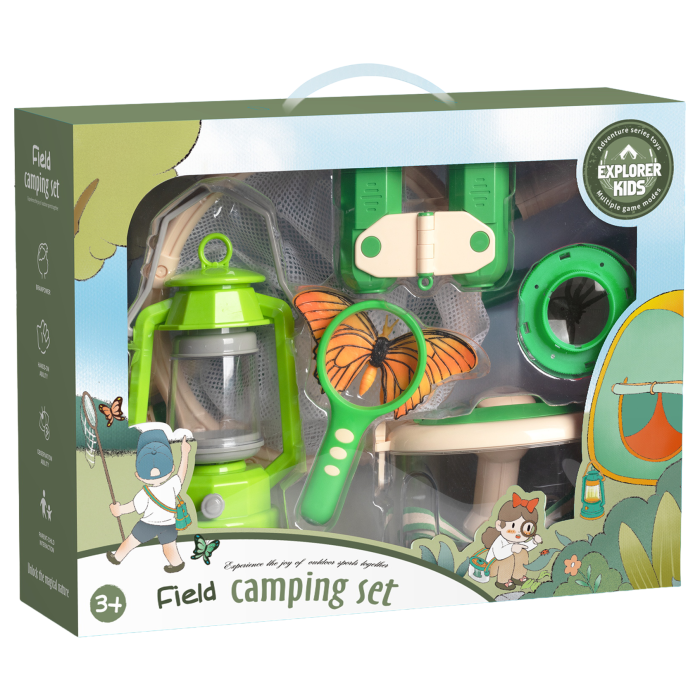 Included for instant adventures: 1x binoculars, 1x lantern, 1x insect, 1x butterfly, 1x magnifying glass, 1x catching net, 2x insect boxes. Everything packs neatly and heads out with you for hours of discovery.