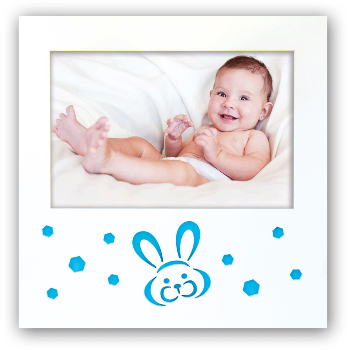 Discover the WP0257B from Zep Italia, a wooden photo frame designed to hold one 13x18 cm photo. This charming white frame features a playful design with a cute blue bunny that makes any baby photo extra special. With overall dimensions of 21x21 cm including the frame, it adds a fun touch to your interior. Display your favorite memories in this horizontal photo frame and create a warm, personal atmosphere at home.