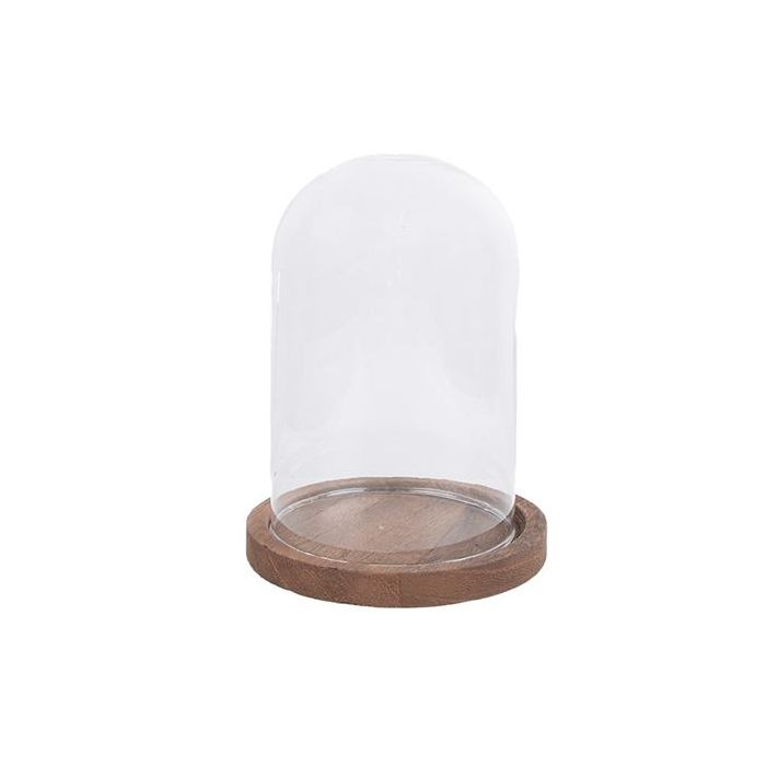 The Clayre Eef Cloche 6GL1944 Ø 12x16 cm adds a touch of class and elegance to any setting. This petite round glass dome with a wooden base shines in displaying smaller decorative pieces like plants, candles, or jewellery. Its transparent glass beautifully reveals your items, while the natural wood base injects warmth and a rustic charm into the look.