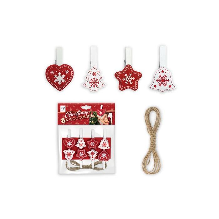 Transform those beautiful moments into charming home displays with these delightful wooden clips. Perfectly designed for putting up your Christmas photos and cards, these mini clips add a sprinkle of festive magic to any wall. The pack includes 8 clips and 200 cm of photo twine, allowing you to craft a unique and heartwarming decoration. With varied shapes and Christmas-themed patterns, they're an ideal gift for the holiday season!