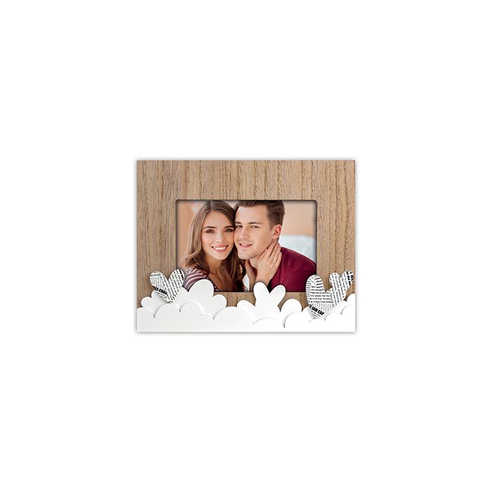 Discover the Zep HP767 Romina Horizontal 10x15 cm photo frame, an elegant way to showcase your special memories in style. This wooden photo frame, finished in white and brown tones with a subtle decorative print, not only holds one photo but also enriches your space with its 3D heart-shaped decorations. With overall dimensions of 17 x 22 cm, this frame fits perfectly on any table or wall, displayed horizontally with a loving theme.