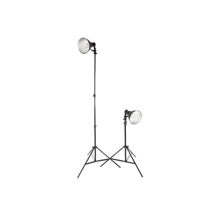 This set comes with the following accessories: 2 lamp holders (LHER-2040), 2 reflectors (ø 19.5 cm), 2 spiral bulbs (40W), and 2 stands (LS-804, 2 meters). With this comprehensive package, you have all the essential gear for any lighting arrangement.