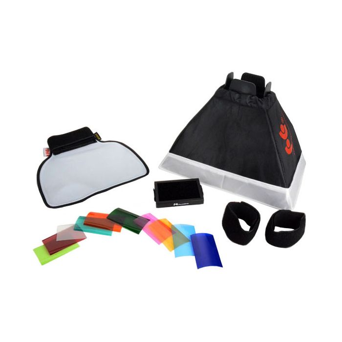 This set includes one honeycomb grid, a 20 x 15 cm double-sided reflector, and a handy 20 x 30 cm softbox. You’ll also get two 26 cm velcro straps, plus 10 color filters for extra creativity. All these handy accessories come in an attractive colorful package.