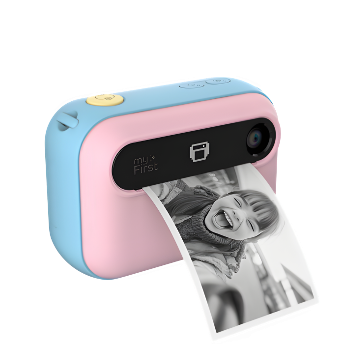 myFirst Insta 20 Pink: lightweight kids camera (16MP, 3" screen) with instant thermal printing. 1080p video, PixTure OLED, 800mAh battery. Includes free thermal paper while stocks last.