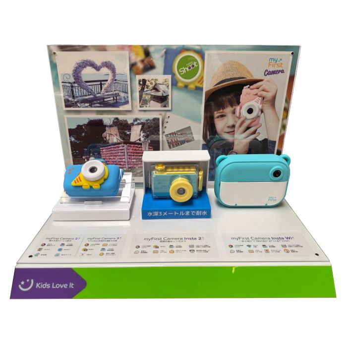 The myFirst Display includes all the parts shown in the picture, including the three dummy cameras. Its clean yet playful design draws attention and highlights your products beautifully. It’s a fun way to make your myFirst collection stand out!